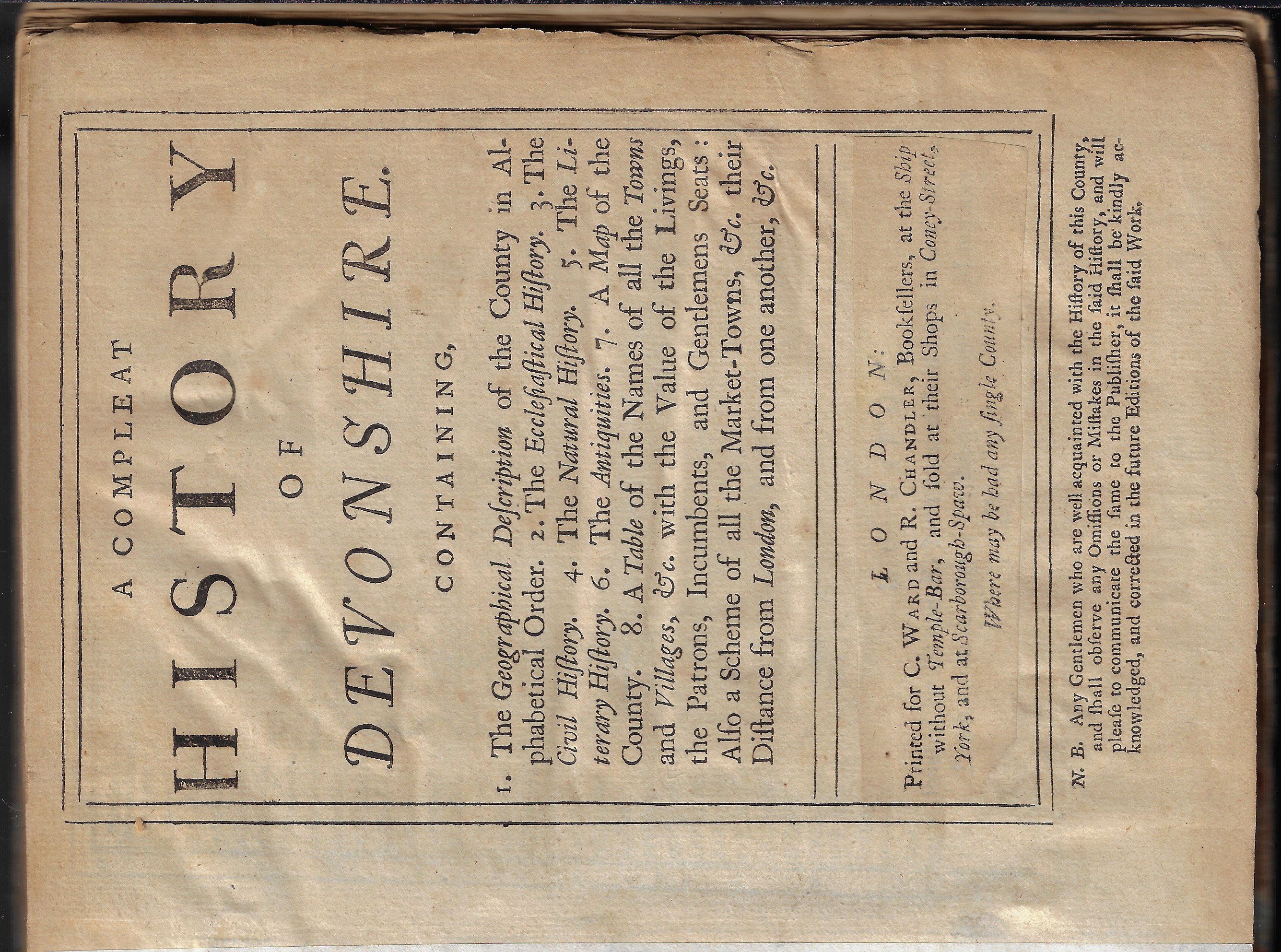 A Compleat History of Devonshire appeared circa 1730. The image is a recently discovered copy of Ward & Chandler´s reissue of 1738-9: in an attempt to sell off old printed stock. Other titles were publshed later until circa 1800. Copies with no title page are possibly slightly earlier. Click here for direct access.